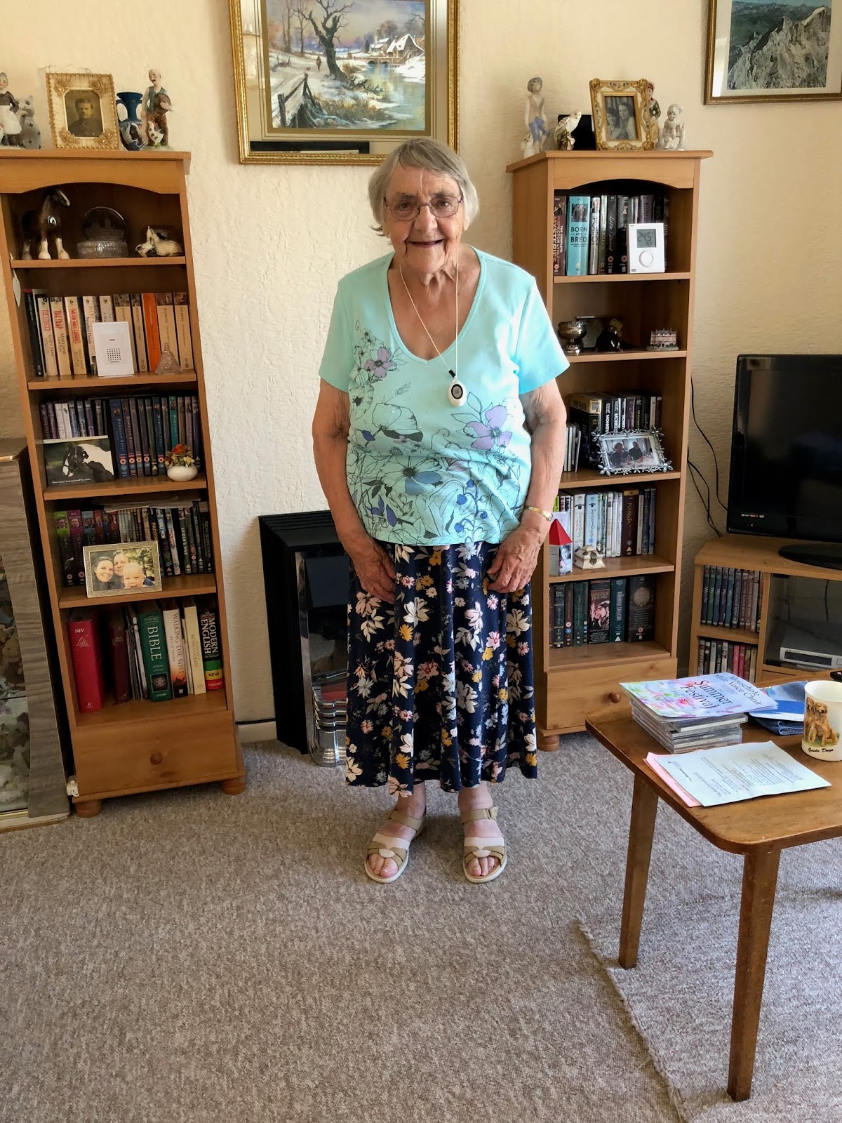 "Yes, I'm a'right now, just a bit shook up is all," she said in her thick Manchester accent. I was pleased to note that the accent was becoming easier for me to understand. She smiled and pointed out the necklace device she wears to alert the medical people if she falls again. It beeps at them, and then they send an ambulance.